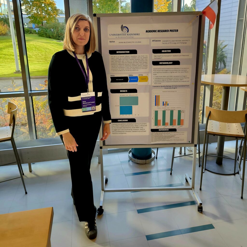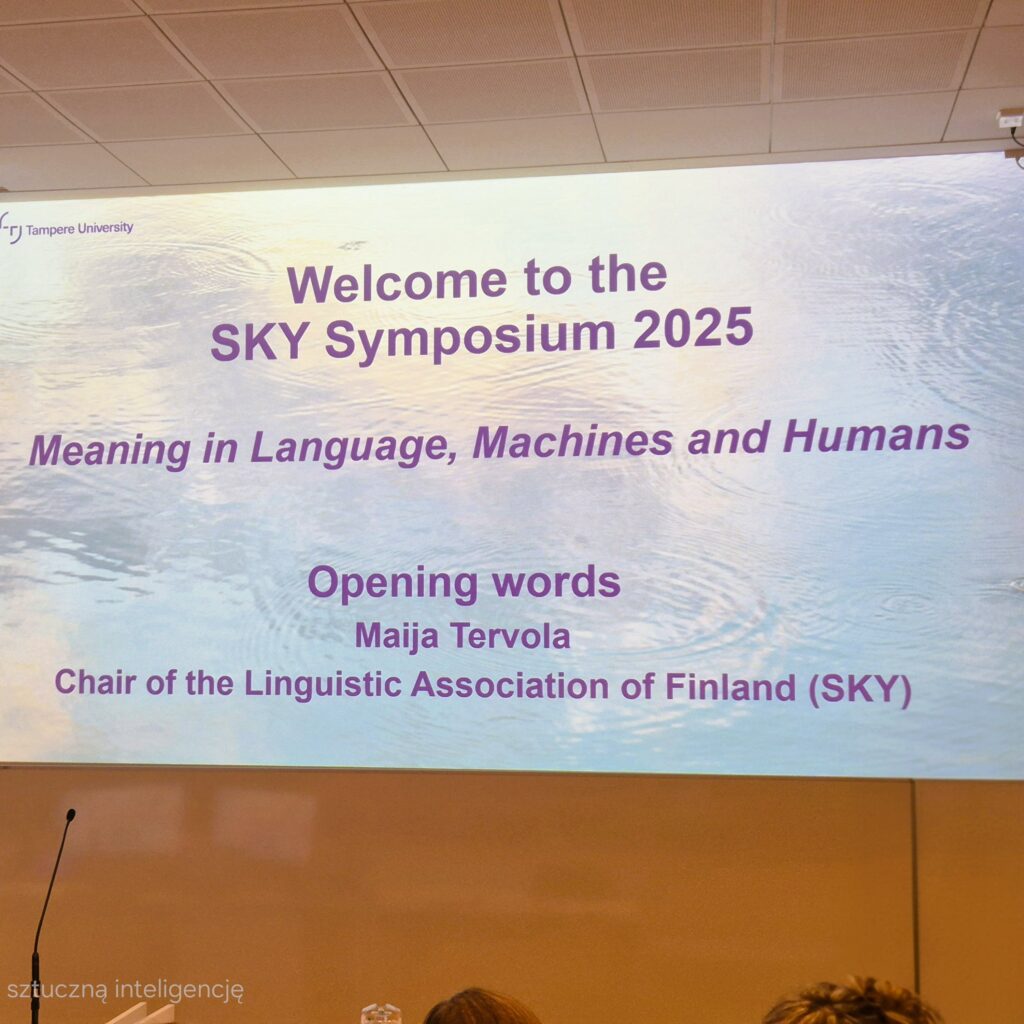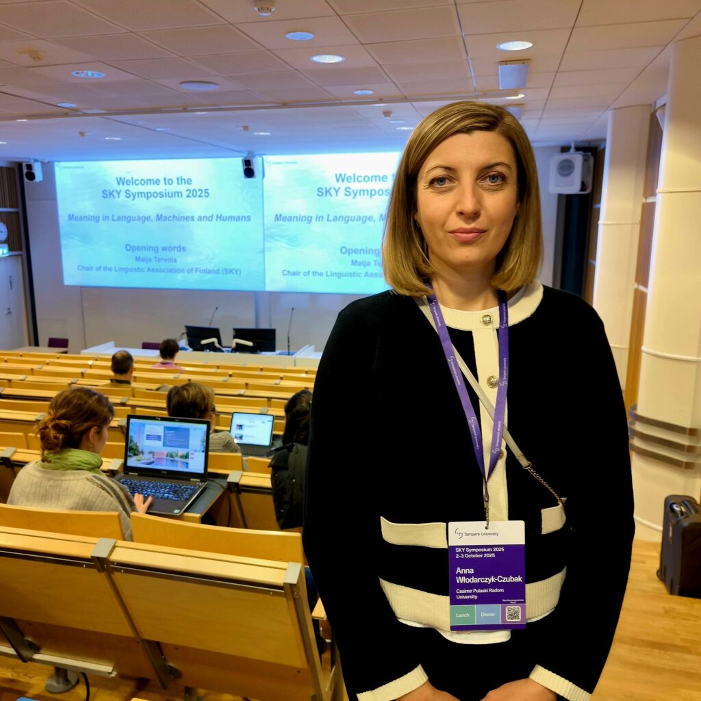 W dniach 2-3 października 2025 r. Pani Mgr Anna Włodarczyk-Czubak wzięła udział w konferencji Naukowej SKY Symposium 2025 w Tampere (Finlandia), zorganizowanej przez Linguistic Association of Finland (SKY), pod tytułem „Meaning in Language, Machines and Humans”.
