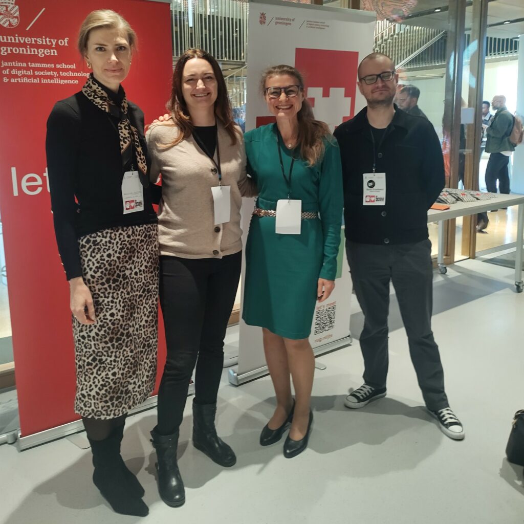 Na zdjęciach (od lewej) z mgr Inga Dale: dr Aleksandra Majdzińska-Koczorowicz, Uniwersytet Łódzki, dr Anna Zięba, Uniwersytet Adama Mickiewicza w Poznaniu, mgr Maciej Grzenkowicz, Uniwersytet Groningen; dr Janina Wildfeuer, Associate Professor, Uniwersytet Groningen (Holandia), kierownik zespołu organizującego konferencję; Profesor Charles Forceville, Uniwersytet w Amsterdamie.