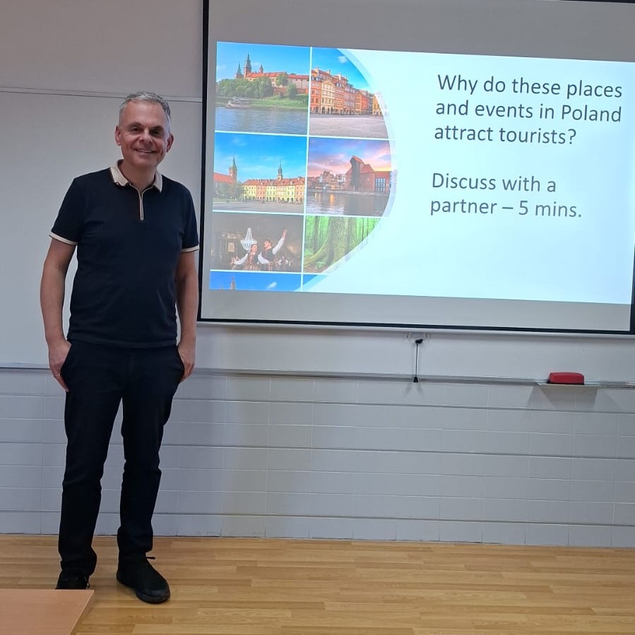 Z przyjemnością informujemy społeczność akademicką o niedawnej wizycie dr. Jamesa Dale’a na Uniwersytecie Balearów w Palmie na Majorce. Dr Dale przebywał tam w ramach programu Erasmus+ w dniach 10-14 listopada 2025 roku, gdzie wygłosił serię specjalistycznych wykładów. Jego prezentacje koncentrowały się na kluczowych zagadnieniach turystyki kulturowej, przyrodniczej i zrównoważonej w Polsce. Wymiana ta dostarczyła cennych informacji wykładowcom i studentom uczelni.