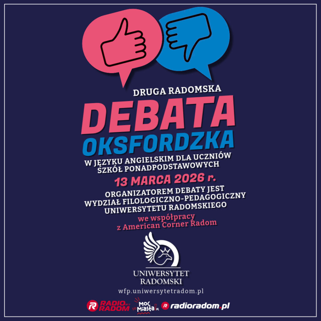 Już 13 marca 2026 r. odbędzie się I etap Drugiej Radomskiej Debaty Oksfordzkiej w języku angielskim. Organizatorem wydarzenia jest Wydział Filologiczno-Pedagogiczny Uniwersytetu Radomskiego, we współpracy z American Corner Radom, a koordynatorem debaty jest dr Beata Nawrot-Lis. Patronat medialny nad wydarzeniem objęło Radio Radom.
